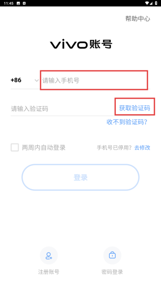 1、打开登录界面,输入【手机号】后,点击【获取验证码】。