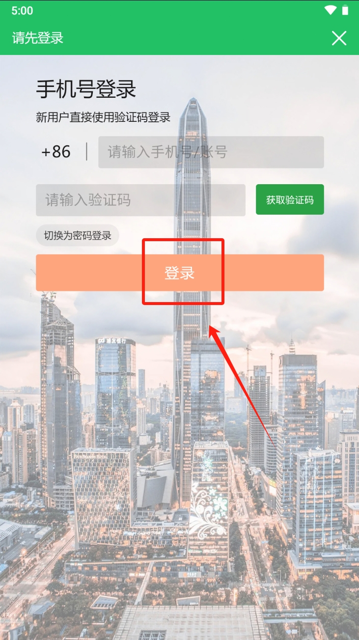 1、输入手机号并点击“获取验证码”,然后点击“登录”按钮。