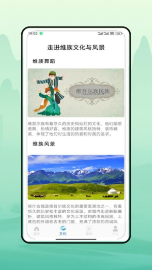 3、应用还提供有关维族传统习俗和风景的内容,让用户全方位了解维族文化背景,增加学习的趣味性。