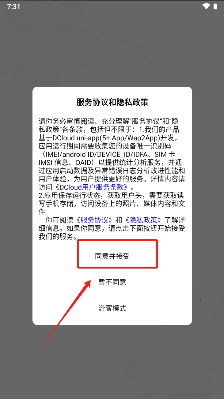 1、阅读并同意“服务协议和隐私政策”,点击“同意并接受”以继续注册流程。