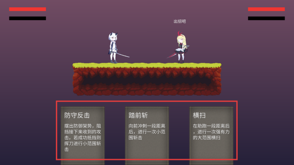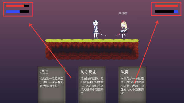 2、左上方显示己方血条和技能条,右上方显示敌方血条和技能条,成功攻击即可积攒技能条。