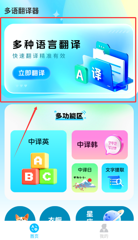 1、首先,下载并安装多语翻译器,完成后打开应用程序,进入主界面后可以选择需要翻译的语言对。