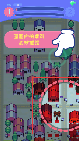 2、当圆圈最大时,点击屏幕让怪物下落,圆圈内的建筑也随即被摧毁。