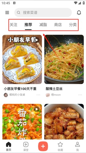 2、浏览菜谱分类:在应用首页,点击顶部的“菜谱分类”按钮,进入菜谱分类页面,这里展示了各种类型的菜谱分类。