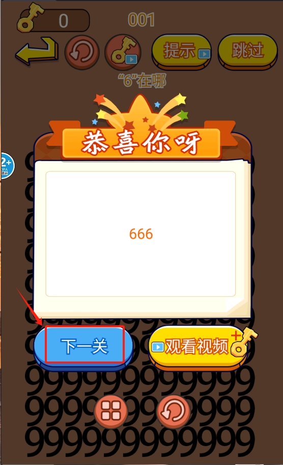 3、成功找到数字“6”后,点击“下一关”按钮,继续你的游戏之旅。
