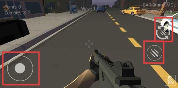 3、进入战斗界面,拖动摇杆移动角色,点击右方框选按键可以装弹和射击。