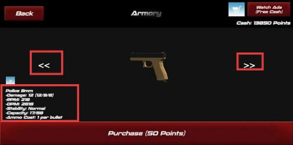 2、在军备处可以查看各武器的性能,点击前后按键可以进行切换。