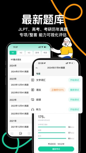 4、包含多种模拟考试题库,涵盖各类日语考试内容,帮助考生针对性备考,增强应试能力与信心。