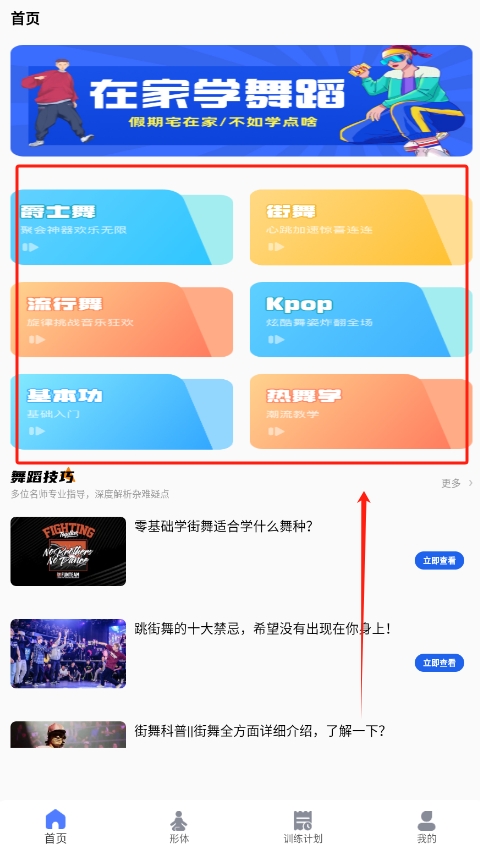 1、首先完成注册后进入主界面,浏览多种舞蹈课程,选择感兴趣的舞蹈风格,开始自己的学习之旅。