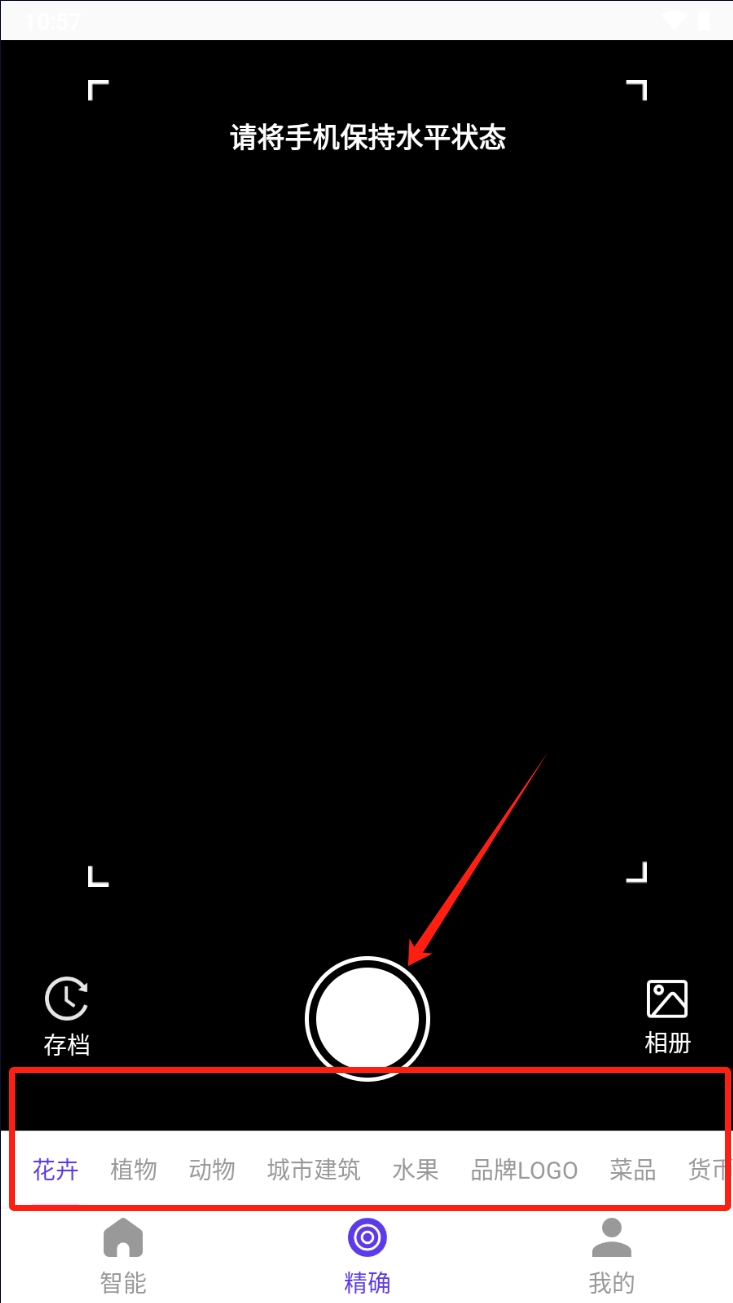 2、将手机保持水平状态,对准需要识别的物体,点击圆圈按钮进行拍摄。