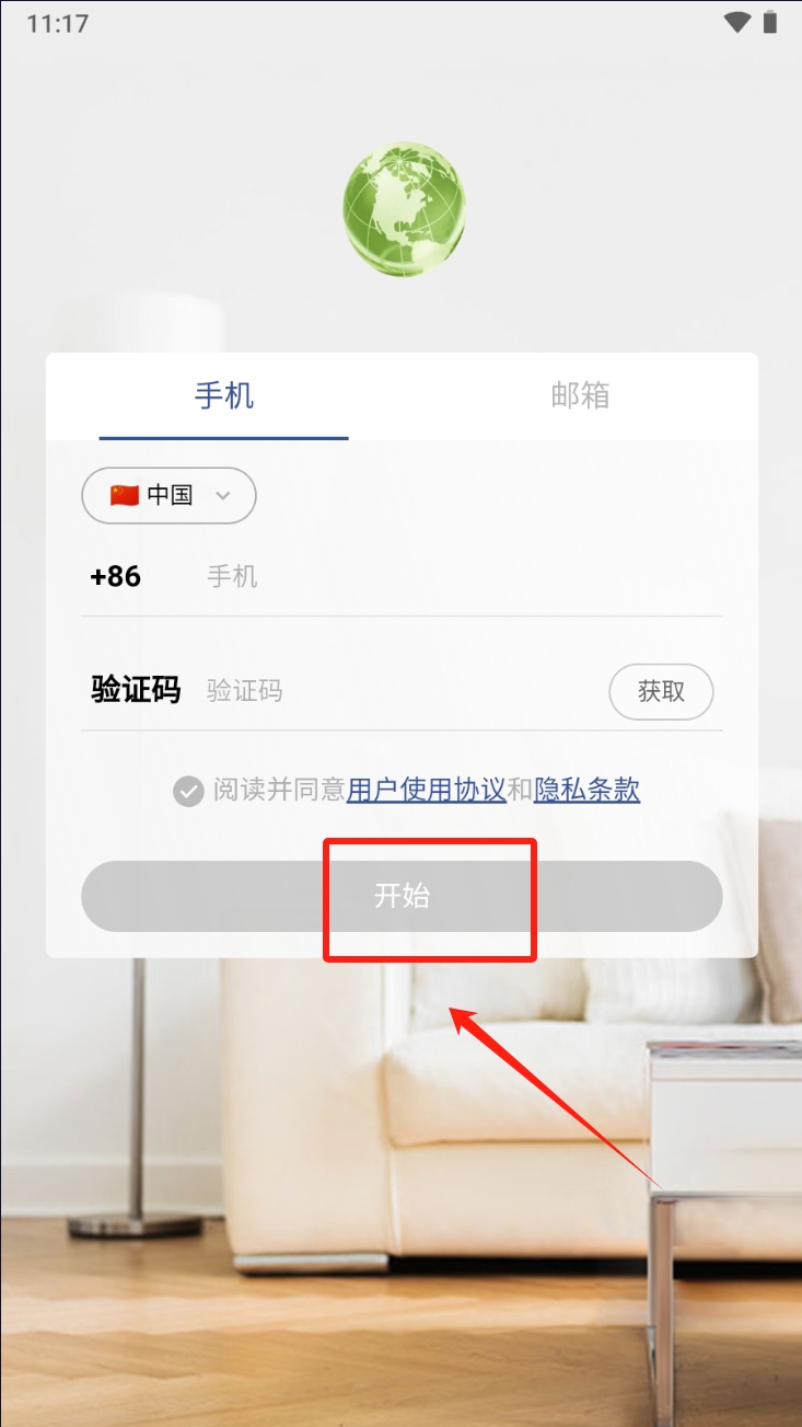 1、首先,选择手机号注册,输入国家代码、手机号并获取验证码,点击“开始”。