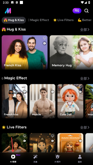 3、返回APP首页,切换至【风格】等板块,浏览【HugKiss】【MagicEffect】【LiveFilters】等分类下的各种特效模板,选择心仪模板进行创作。