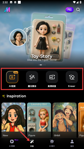 1、打开APP,在首页可选择【AI视频】【魔法涂鸦】【高清修复】【Eraser】等功能,也可点击下方【AI视频】进入相关创作页面。