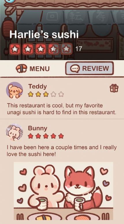 2、有趣角色:游戏中有各种有趣可爱的狗狗角色,它们将陪伴玩家经营寿司店,为玩家带来更多欢乐;