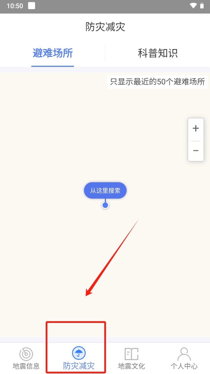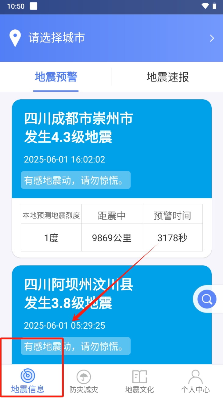 2、从地震信息页点击底部 “防灾减灾” 图标,进入对应页面。