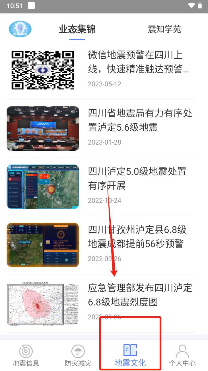 3、再点击底部导航栏 “地震文化” 图标,进入地震文化内容页。