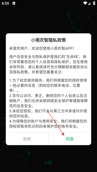 1、首次使用小雨农智APP,阅读《小雨农智隐私政策》后,点击【同意】接受政策。