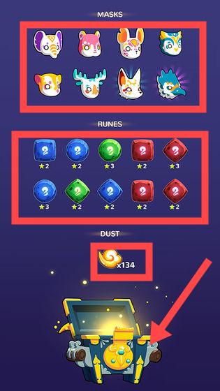 2、进入【MASKS】和【RUNES】界面,选择并搭配面具与符文,利用【DUST】资源,点击宝箱获取更多装备提升实力。