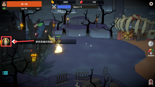 2、点击左上角图标使用英雄的技能来应对敌人。