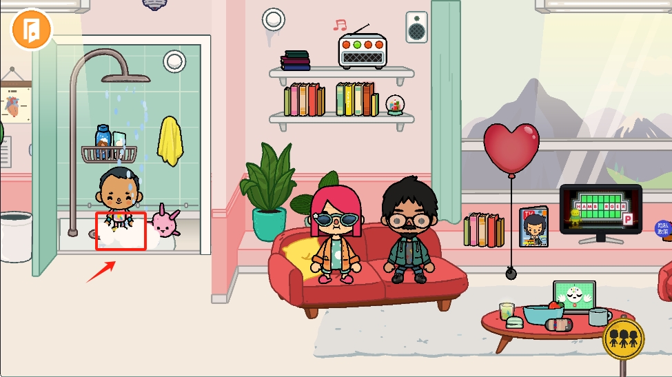 4、进入淋浴间场景,点击淋浴,为小宝宝洗浴。