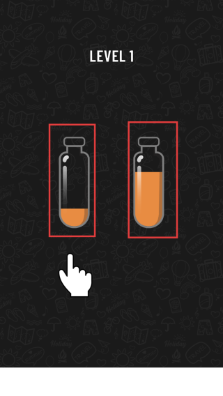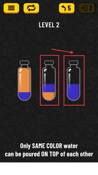 2、倒水操作规则:点击选择试管,将其中的水倒入另一试管,需满足水颜色相同且目标试管有足够容量,装满同色液体即可通关。