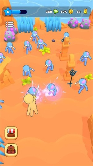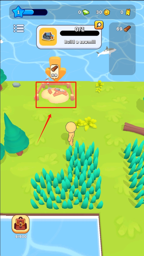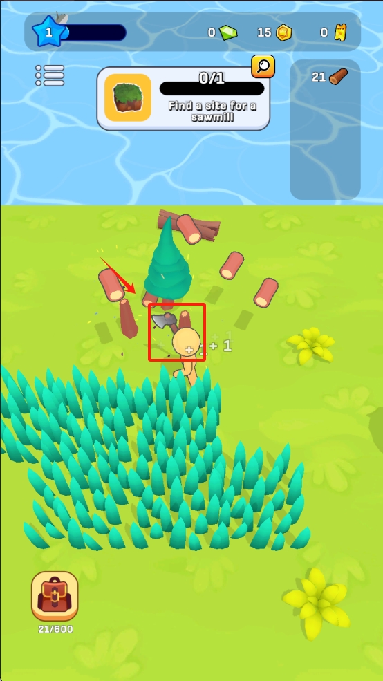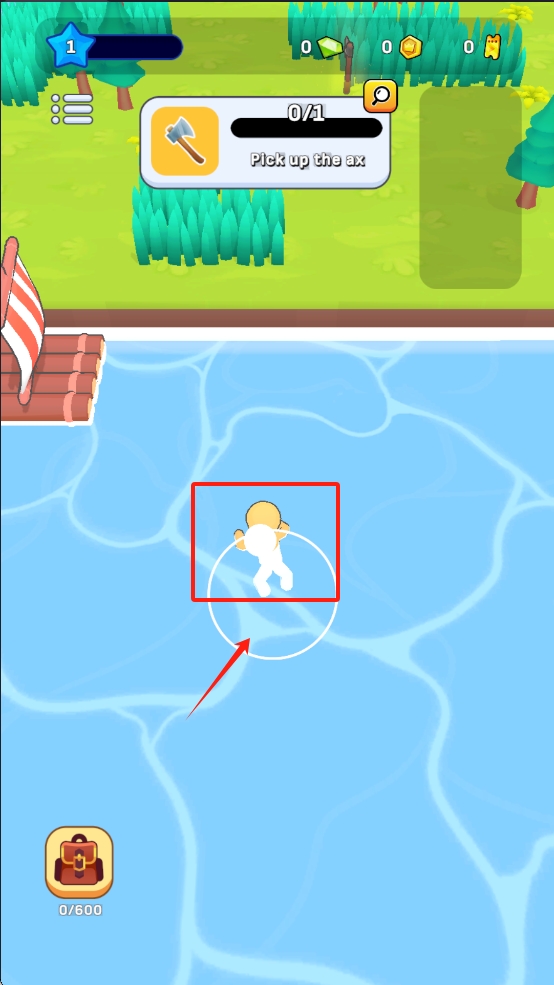 1、点击游戏角色,使其在水中移动,上岸拾取斧头。