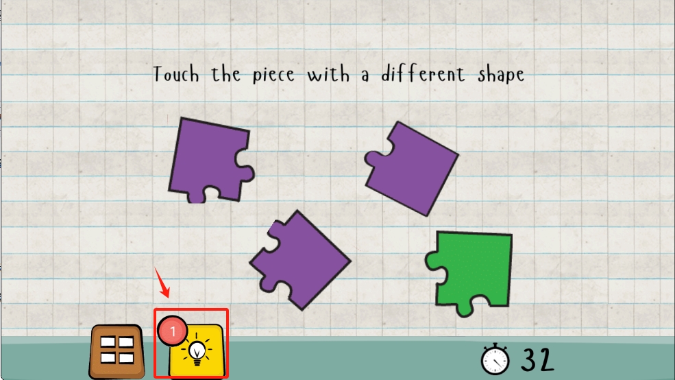 1、游戏初始界面,点击提示功能按钮,系统会提示玩家点击形状不同的拼图块。