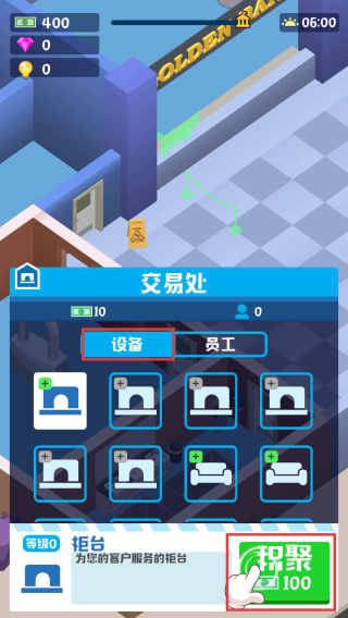 2、点击【设备】,再点击【积聚】即可获得一个柜台。