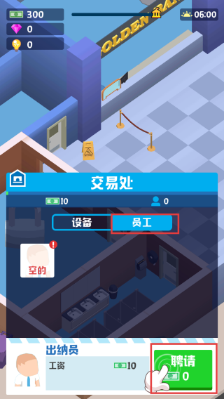 3、点击【员工】后,点击【聘请】即可拥有一位在柜台工作的员工。