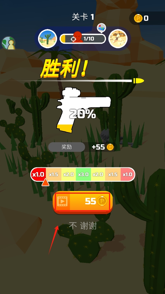 3、关卡胜利界面,点击“不 谢谢”按钮,直接领取奖励。