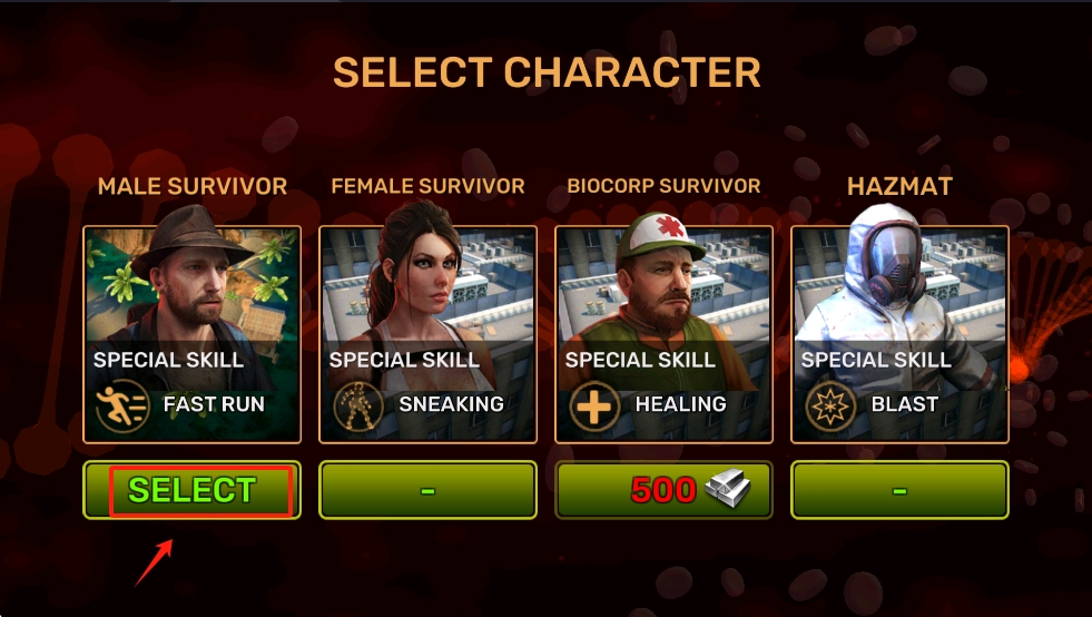 1、点击角色下方的“SELECT”按钮,选择游戏角色,每个角色都有独特技能。