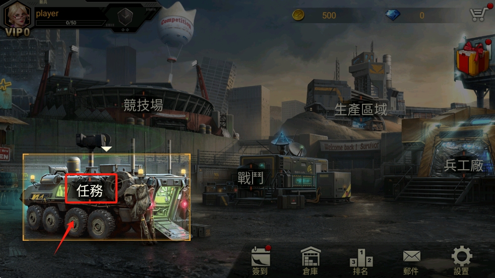1、进入游戏主界面后,点击左下角标注“任务”的按钮,进入任务选择界面。
