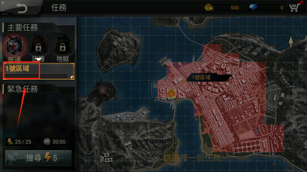 2、在任务界面左侧选择“主要任务”,点击地图上的“1号区域”,开始执行相应任务。