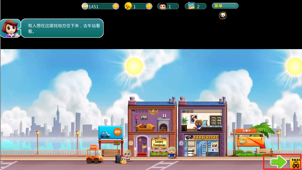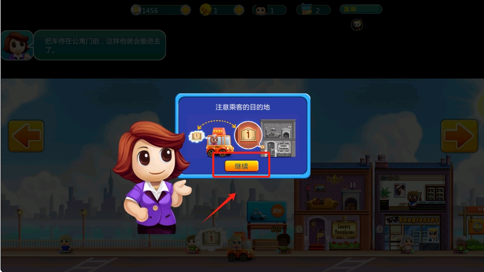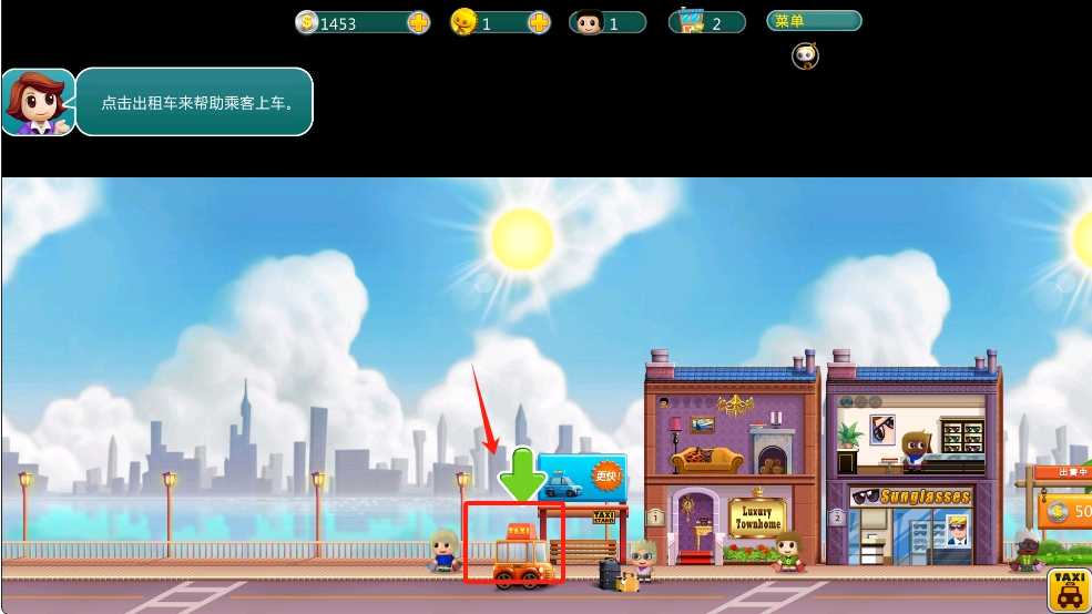 1、在出租车提示界面,点击出租车,帮助乘客上车。