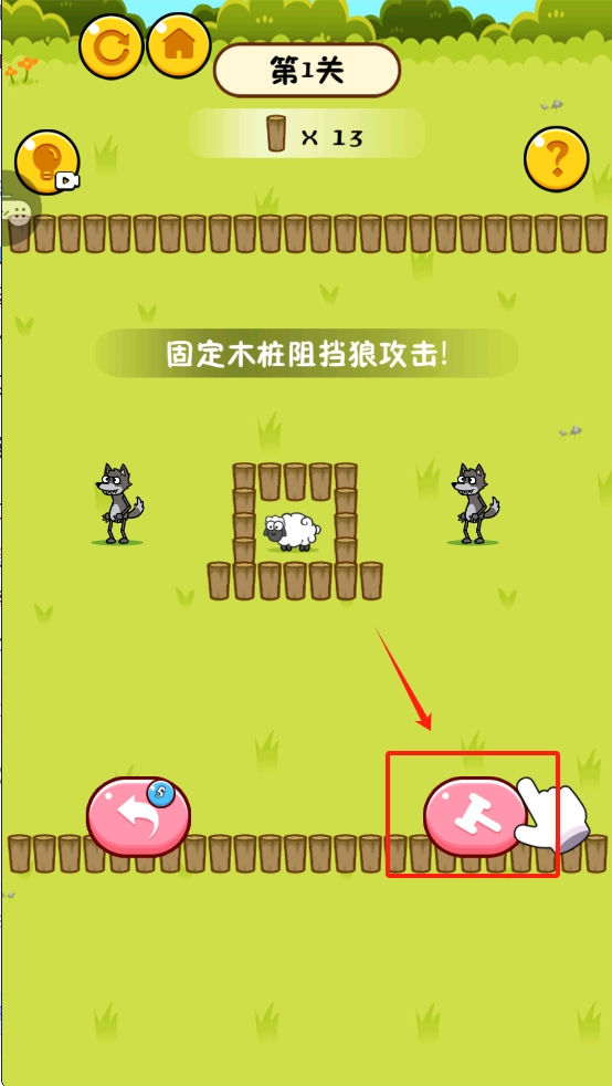 3、通过点击屏幕下方的跳跃按钮来固定木桩,成功阻挡狼的攻击并保护小羊。