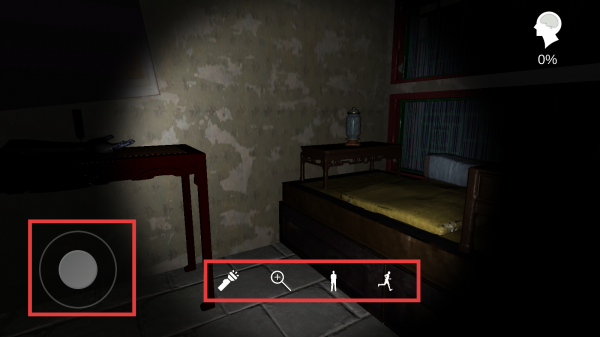 3、拖动摇杆控制角色移动,点击控制栏对应图标,可以开关手电筒、放大缩小观察、切换蹲立姿势、切换行走速度。