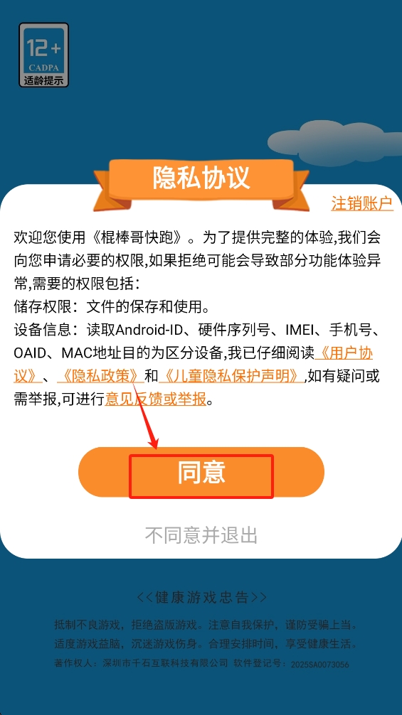 1、阅读并同意隐私协议。点击“同意”按钮以接受条款,继续游戏进程。