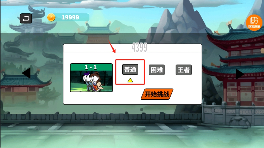 3、在关卡信息界面,选择“普通”难度,然后点击“开始挑战”。
