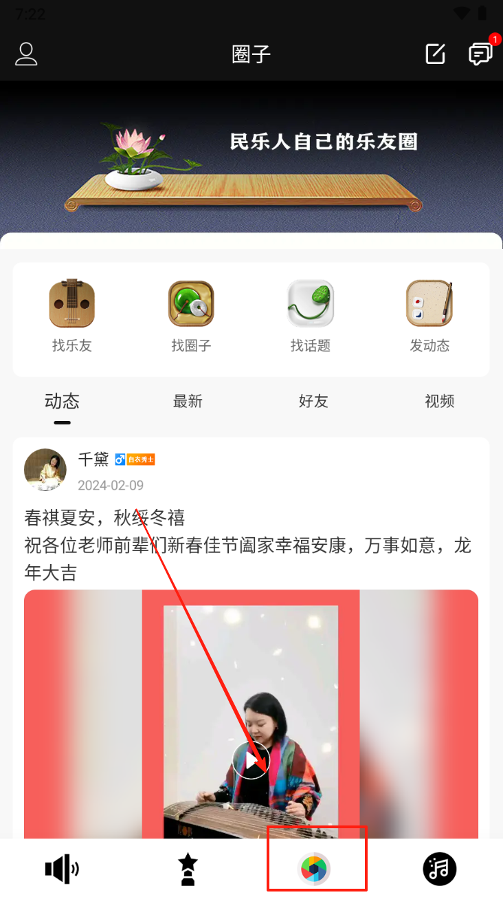 1、进入乐友圈首页,点击底部导航栏中的“动态”图标,查看最新动态内容。