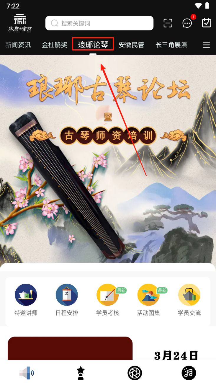 4、点击顶部导航栏中的“琅琊论琴”图标,进入琅琊古琴论坛,参与古琴师资培训。