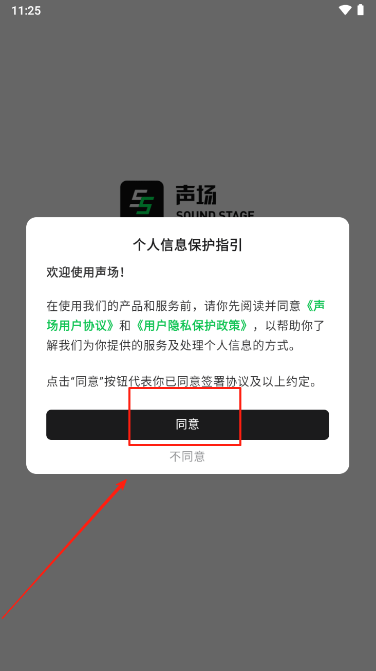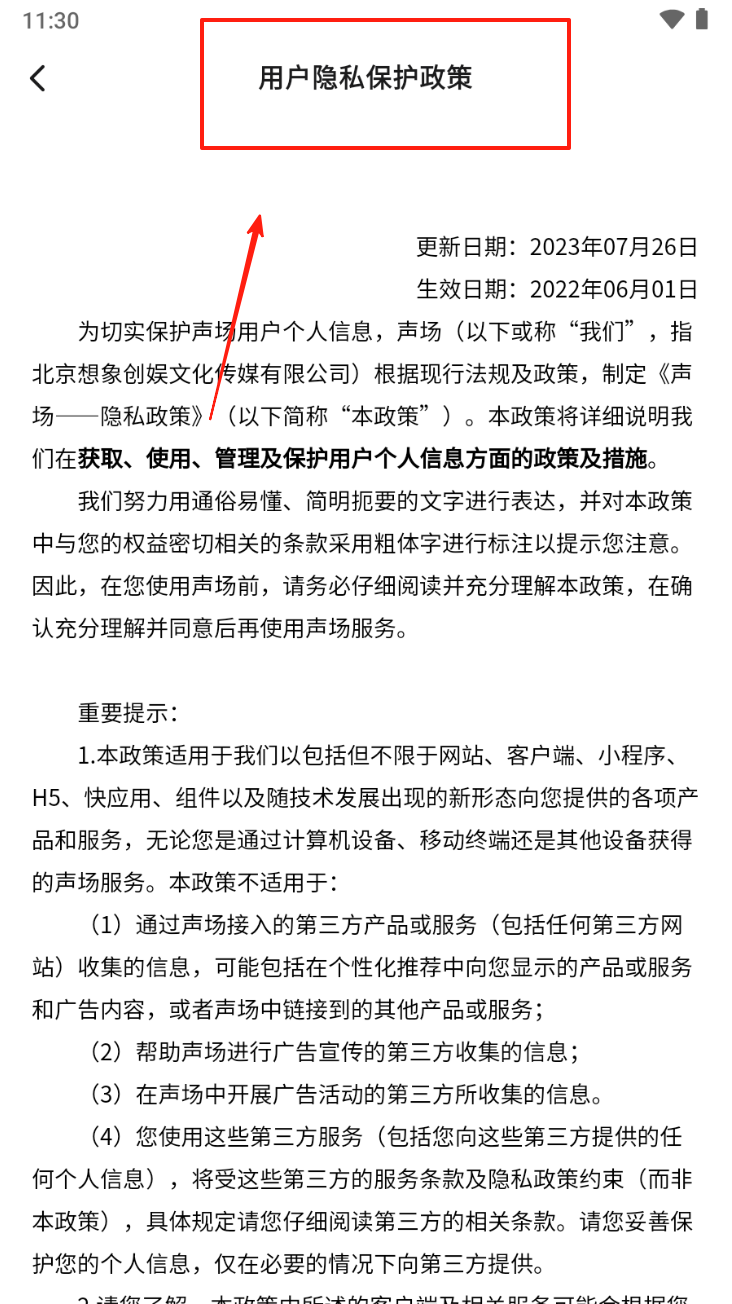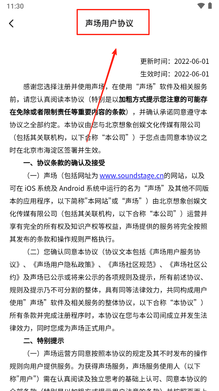 3、在用户协议页面,点击“声场用户协议”和“用户隐私保护政策”链接,阅读并了解相关条款。