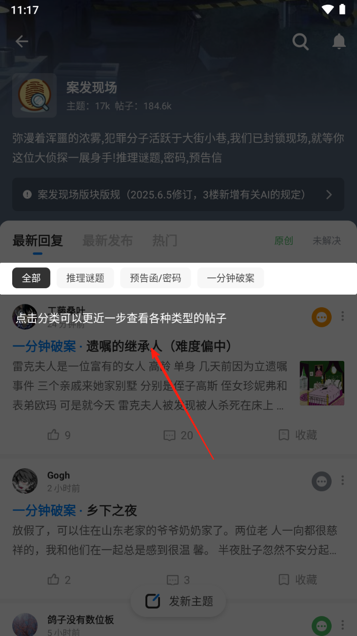 4、在帖子页面,点击“发新主题”按钮,发布自己的推理题目或参与讨论。