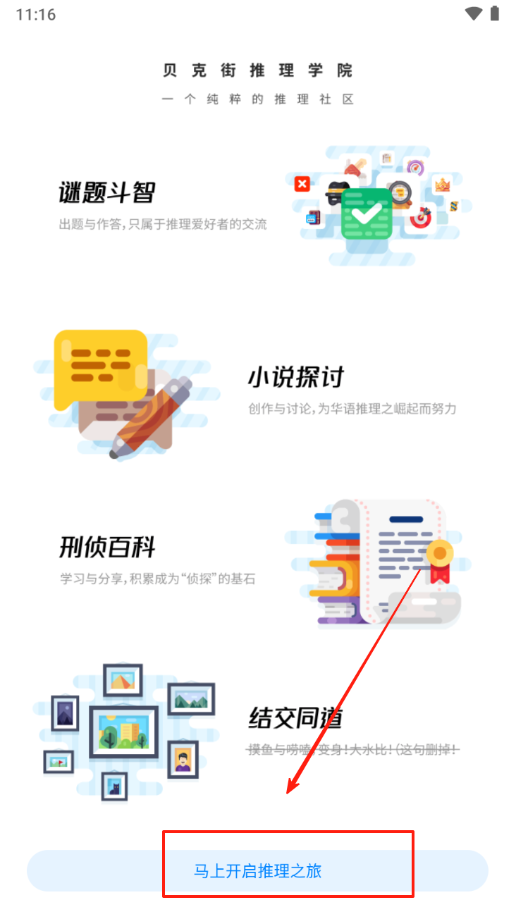 1、在欢迎页面,点击“马上开启推理之旅”按钮,进入推理社区。