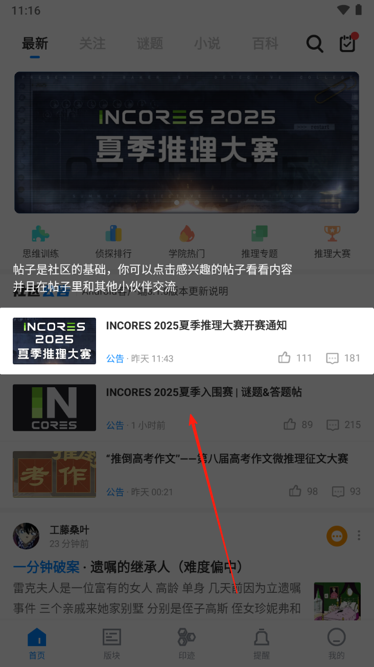 3、在版块页面,选择并进入特定版块,如“案发现场”,参与推理活动。