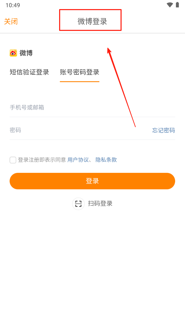 4、在登录方式选择页面,点击“微博登录”按钮,使用微博账号进行登录。