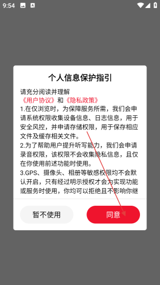 1、打开应用查看个人信息保护指引点击同意。