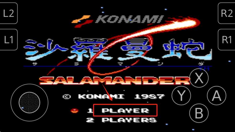 1、在游戏主界面,用虚拟摇杆移动光标至“1 PLAYER”,按“B”键确认开始游戏。