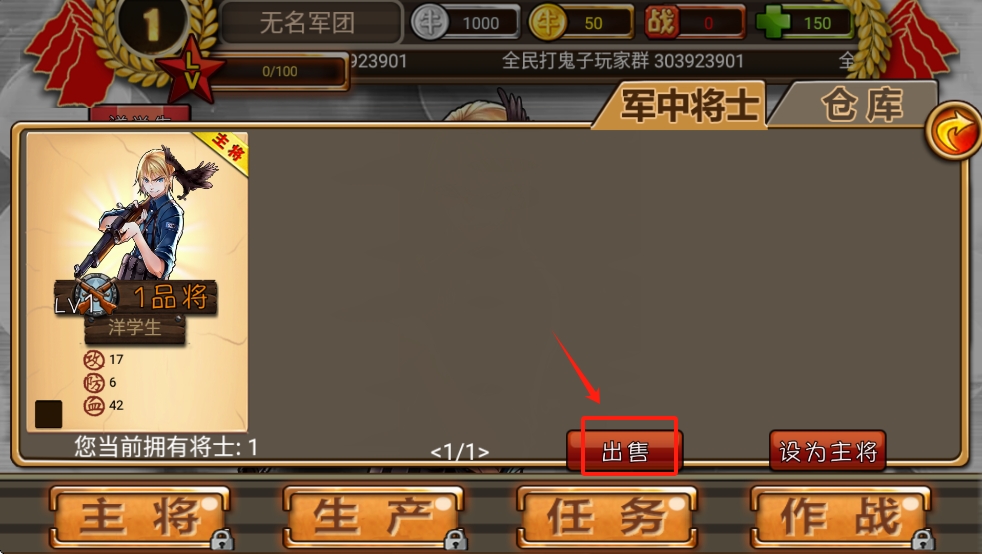 3、点击将领信息卡右侧的“出售”按钮,出售当前将领并获得相应资源。