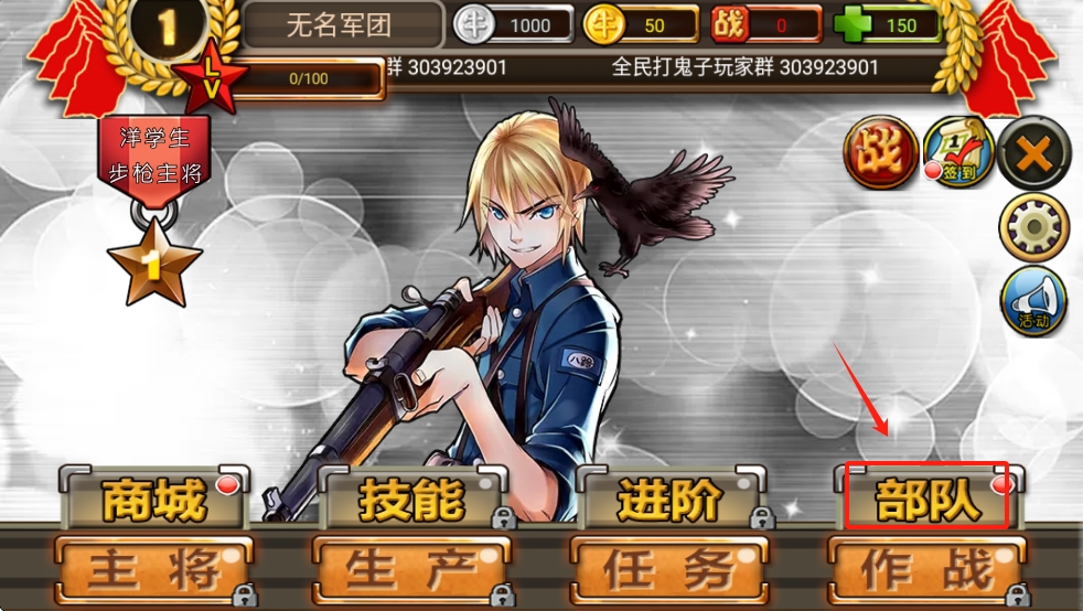 1、进入游戏主界面,点击“部队”按钮,进入将领管理页面。
