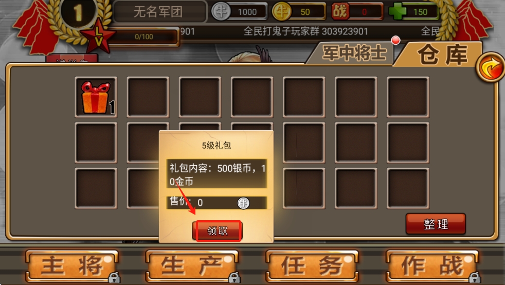 2、点击“领取”按钮,可领取系统赠送的5级礼包,内含500银币和10金币。